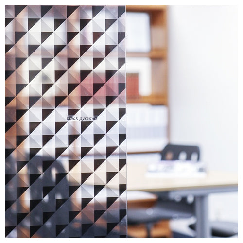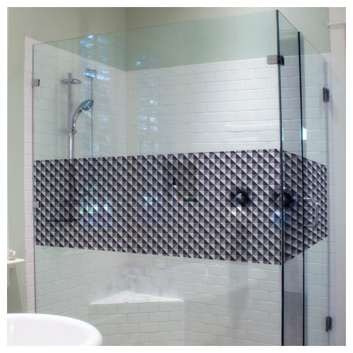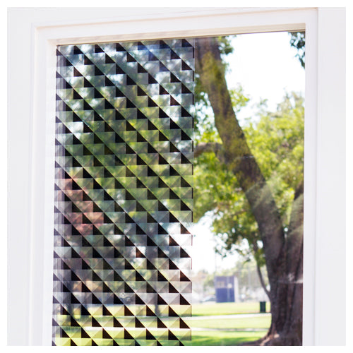 Squares in a diamond formation divided into four subsections each with a different shade of black on clear window film. The pattern repeats across the entire roll of film. Each fourth of a square is 24 millimeters in length.