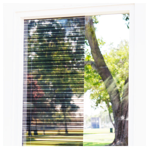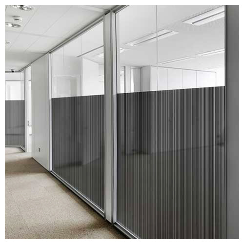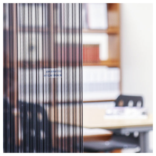 Erratically spaced vertical black lines on clear window film. This film provides semi-obscurity.
