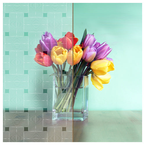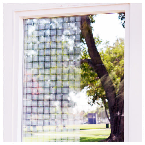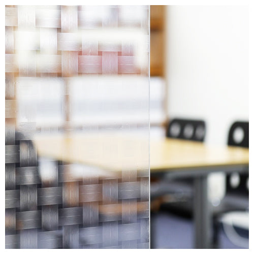 Rectangles of lines that alternate horizontally and vertically to achieve a crosshatched pattern etched on clear window film. Each rectangle is 40 millimeters long and 25 millimeters high.