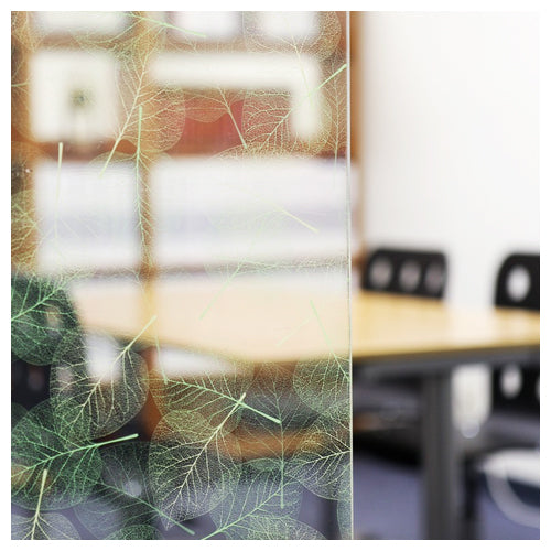 Leaf patterns with varying shades of green erratically placed on clear window film. The pattern repeats across the entire roll of film.