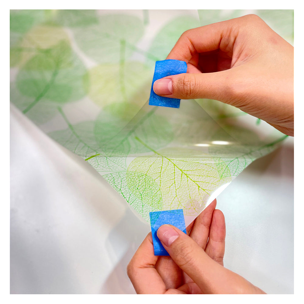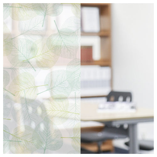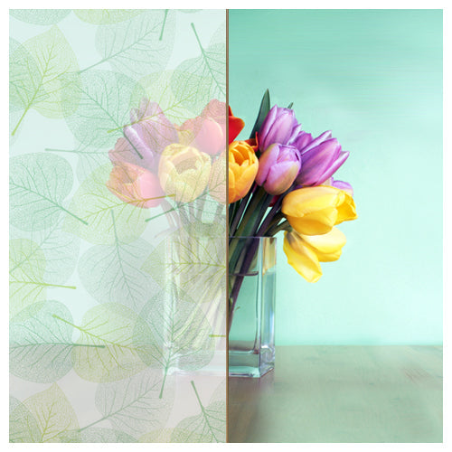 Leaf patterns with varying shades of green erratically placed on white matte window film. The pattern repeats across the entire roll of film.